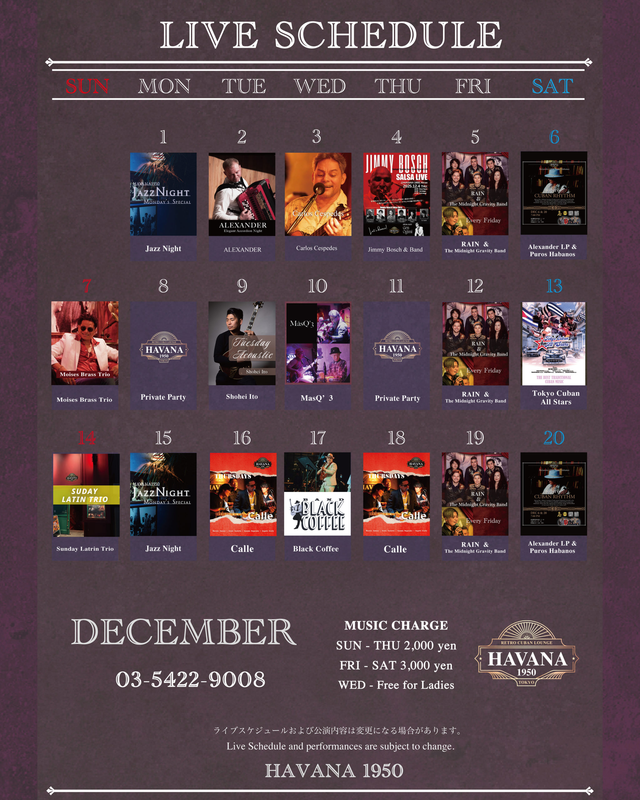 音楽とともに、まるで古き良きハバナに旅をするようなひとときを。ここでしか味わえない、優雅で情熱的な月曜日の夜をお楽しみください。