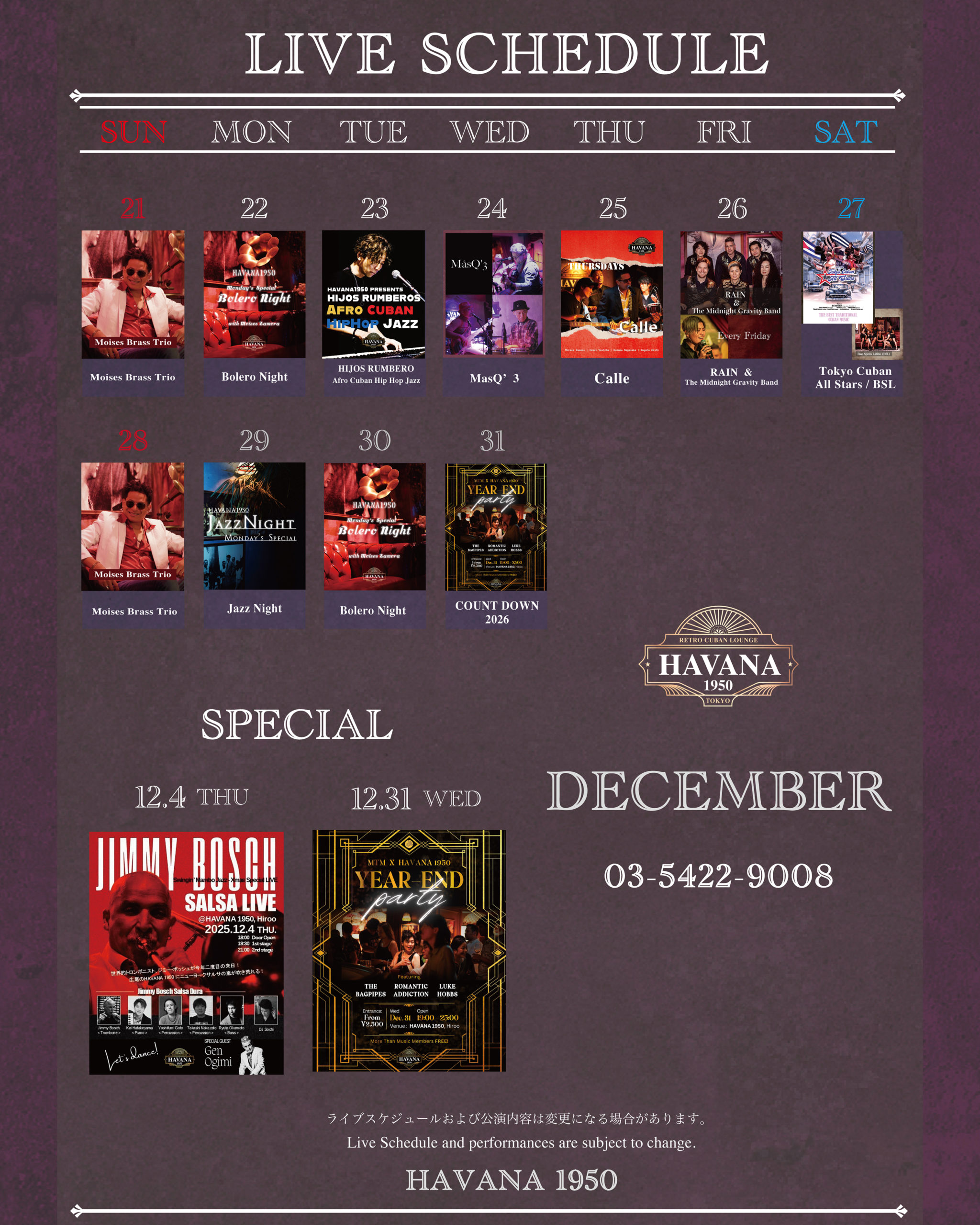 月曜日はHAVANA1950で楽しむジャズの生演奏の夜。 心落ち着く音色に包まれ、美味しい料理とお酒をゆったりと味わう特別なひとときをお届けします。 洗練された空間に響くジャズが、月曜の夜を穏やかに彩ります。 新しい週の始まりを、リラックスできる雰囲気の中で、ぜひ五感でお楽しみください。